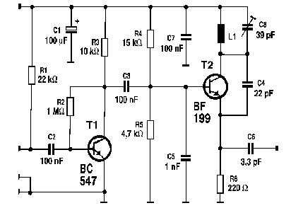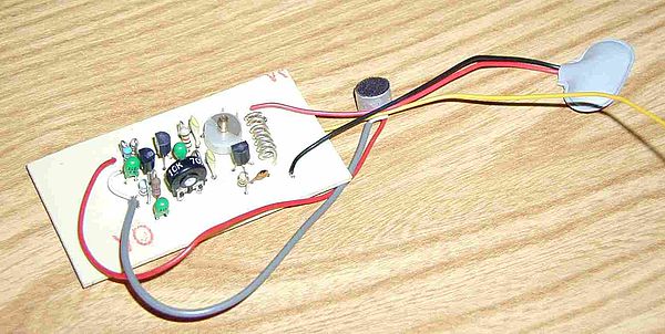 Diese Schaltung sendet im UKW-Bereich ein Audiosignal ab, welches über ein eingebautes Kondensator-Mikrofon aufgenommen wird. Die Sendeleistung ist sehr gering, und die Reichweite ist daher nur einige Meter. Die Sprachqualität ist auf kurzer Entfernung aber optimal. Mit einem handelsüblichem Radio, kann der „eigene“ Radiosender dann empfangen werden.