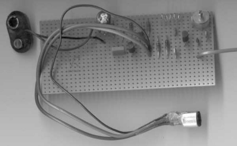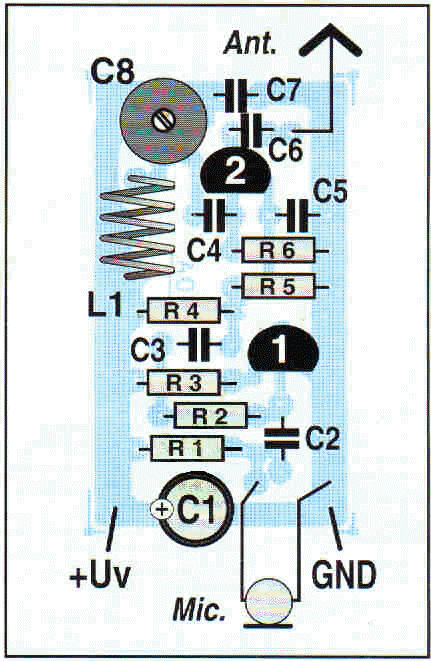 Die Schaltung wird anhand des Plans nachgebaut, die Spule besteht aus versilbertem Kupferdraht 0,5mm,mit 4 Windungen ca. 5 mm Durchmesser. Als Antenne reicht ein 75cm langes Drahtstück. Den Abgleich nimmt man am besten mit einem Kunststoffschraubenzieher vor, man stellt das Radio im Bereich von 100 MHz auf einen freien Bereich ein. Dann drückt man die Spule zusammen und dehnt sie, gleichzeitig dreht man solange am Drehko, bis man im Radio ein Geräusch hört. Ist alles richtig eingestellt kann man seine Stimme glasklar im Radio hören. Je nach Lage des Senders kann sich der Sendebereich etwas verschieben, am besten ist es, ihn in ein Metallgehäuse einzubauen, welches man mit dem Minus-Pol der Batterie verbindet.